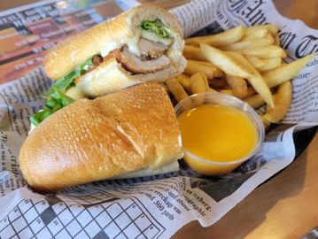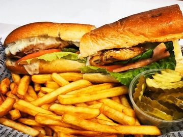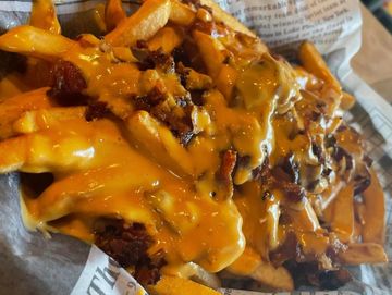 12oz . of chopped chicken breast, cooper sharp cheese, fried onions & fries