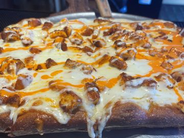 Buffalo sauce topped with crispy buffalo chicken, mozzarella, cooper sharp & gorgonzola