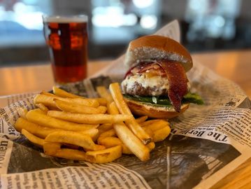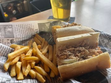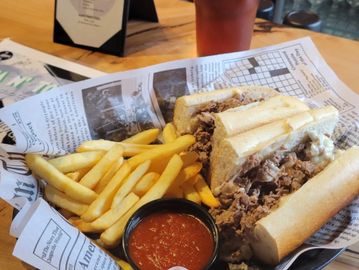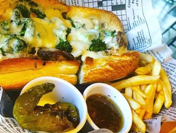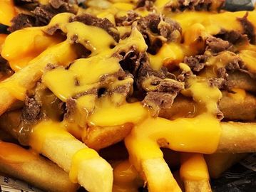 12oz . of chopped steak, cooper sharp cheese, fried onions & fries