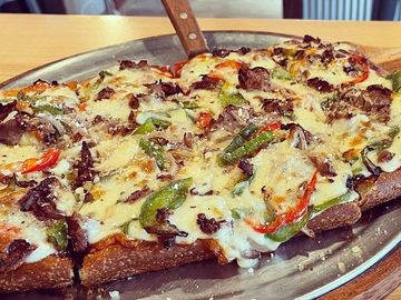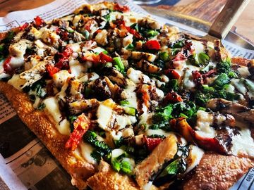 White pizza topped with grilled chicken, broccoli rabe, sundried tomatoes, drizzled with balsamic reduction & mozzarella