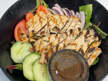 Fresh mixed greens topped with tomatoes, cucumbers, red onions & a side of balsamic vinaigrette dressing
