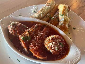Homemade meatballs & sausage in marinara served with parmesan breadsticks